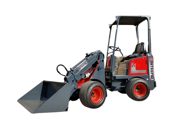 The Intrepid KM100 Tele mini loader as offered by Miniloaders.com are manufactured by the Belgian manufacturer Knikmops, who have manufactured compact wheel-loaders for the western European market for many years. Most of their machines go to paving companies where they see long service lives under hard working conditions. The Intrepid KM100 and KM100 Tele are ideally suited for companies in the green and hardscaping industry. We have experience in equipping and configuring these machines for tree care, landscape and other jobsites.