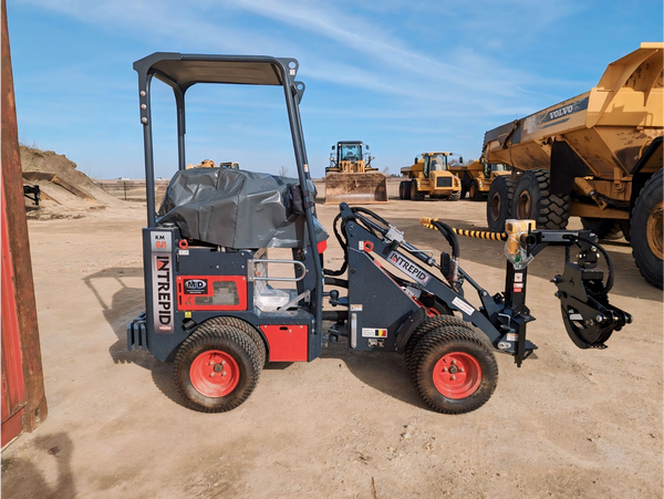 The Intrepid KM85 mini articulating loader is manufactured by the Belgian manufacturer Knikmops. It is truly a one-of-a-kind loader given its extremely compact dimensions, configured to maneuver through small gates and passageways. Even though it’s one of the most compact articulating loaders available in the US, it still boasts an operating capacity of over 1000 lbs. It is faster and lifts more than many mini-skidsteer models. Above all, it has articulating steering, which results in near-zero impact on lawns and other sensitive areas.